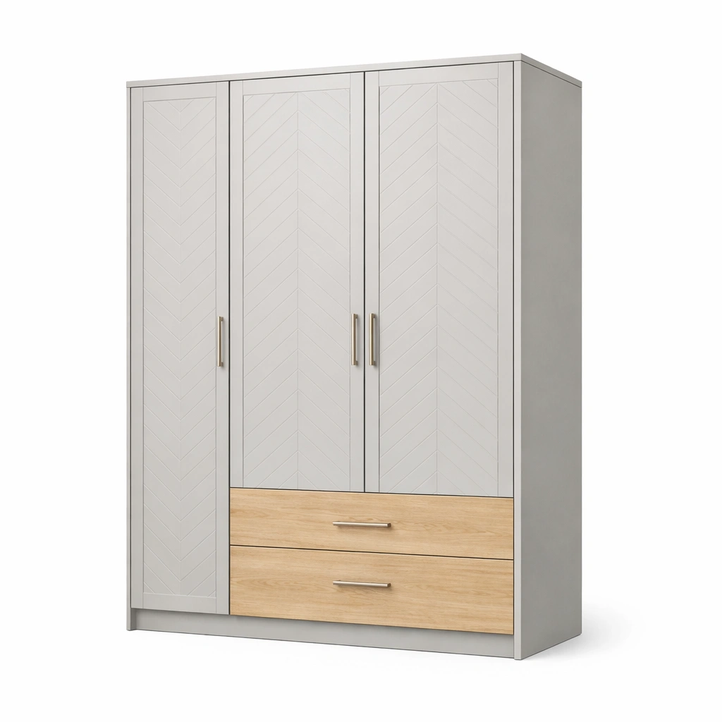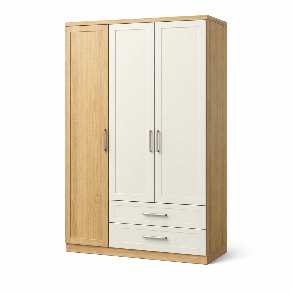 Armadio in legno composito bianco e rovere con cassetti