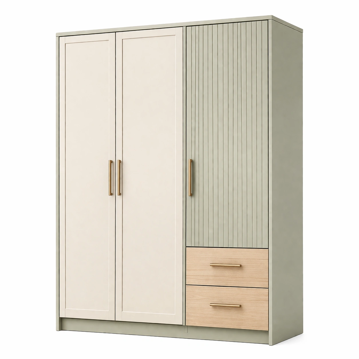 Armadio in mdf con maniglie in metallo e cassetti beige e verde