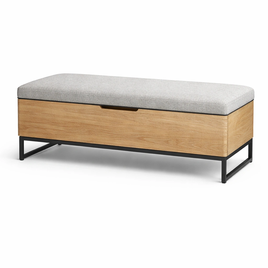 Panca contenitore in legno e metallo con seduta imbottita in tessuto grigio