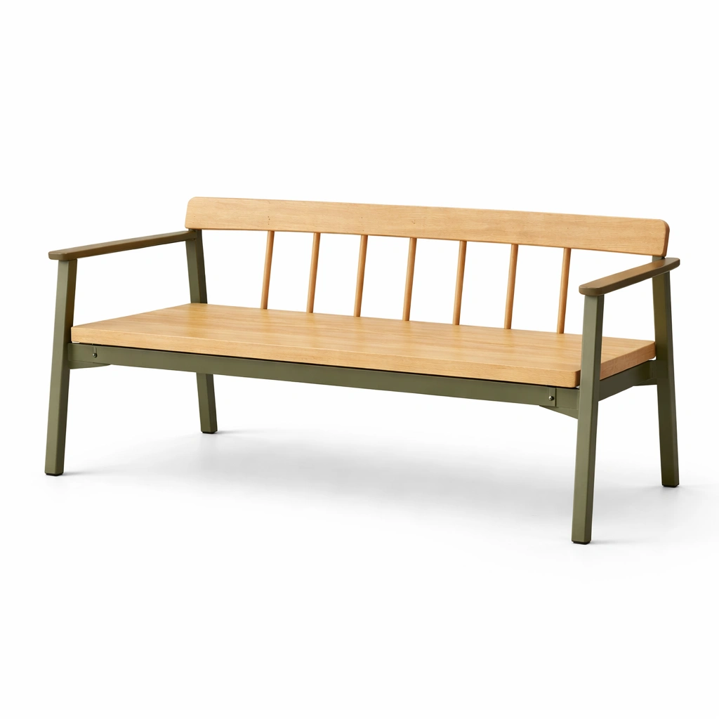 Materiali: Legno massello per seduta e schienale, metallo verniciato a polvere per gambe e struttura.